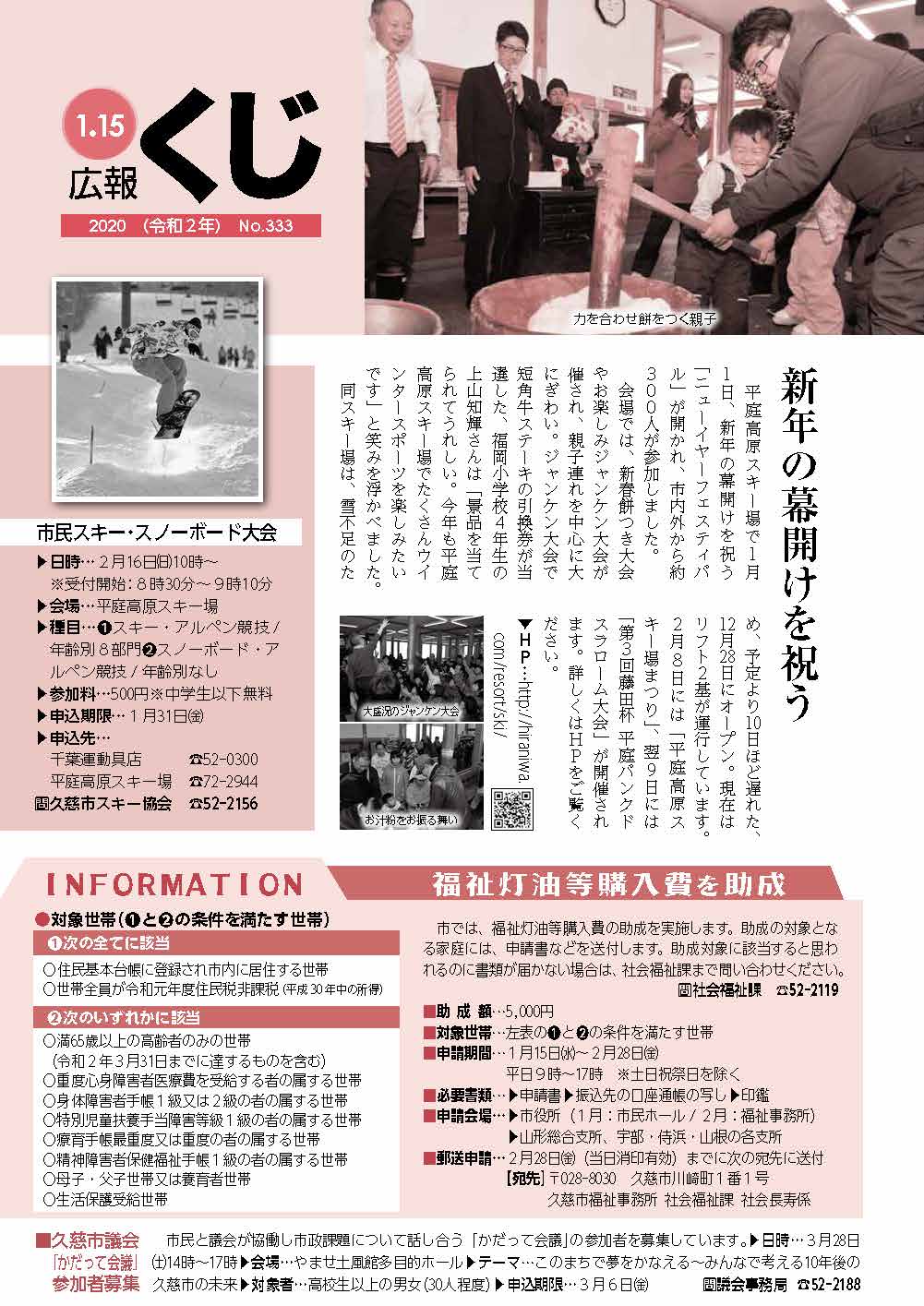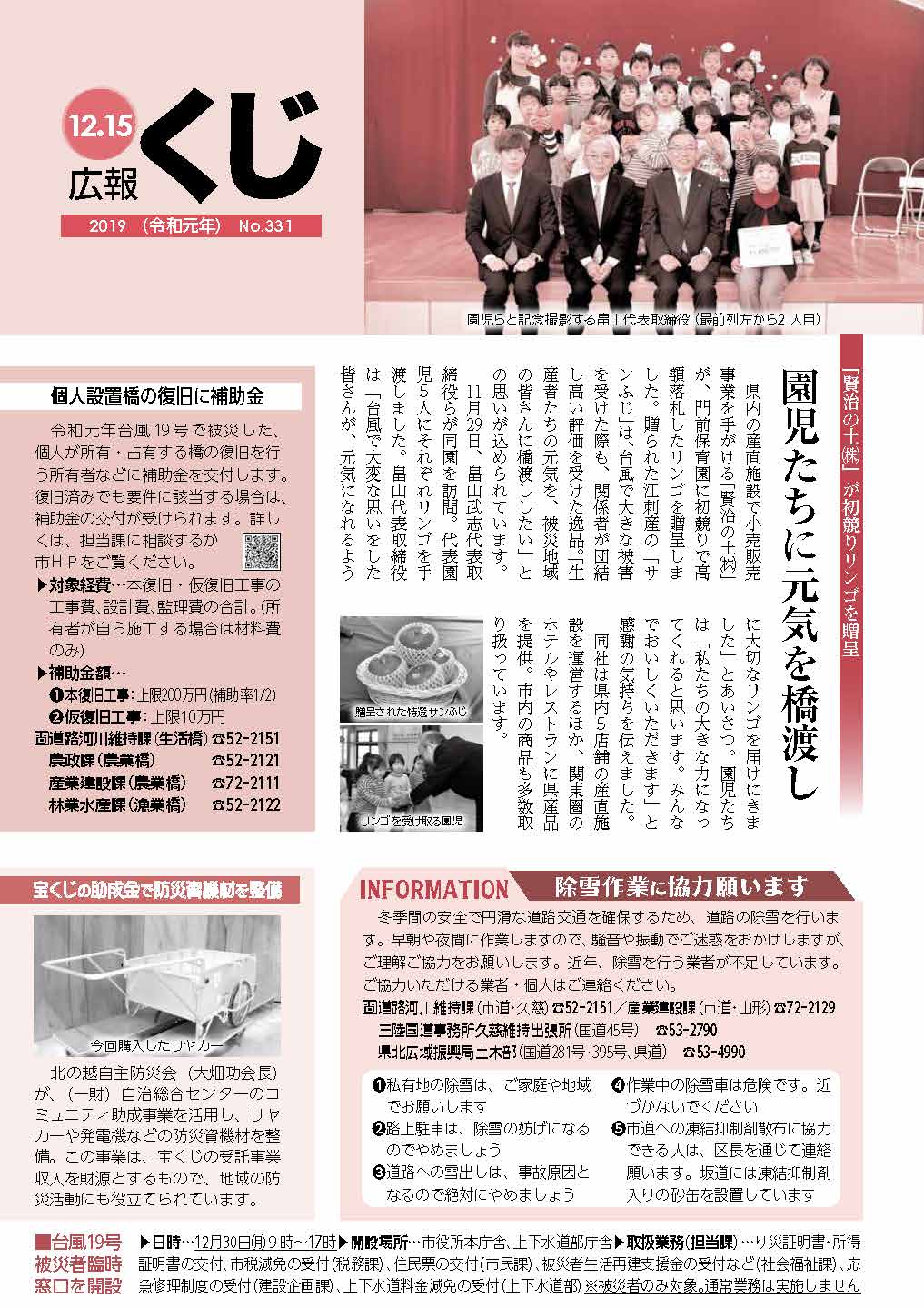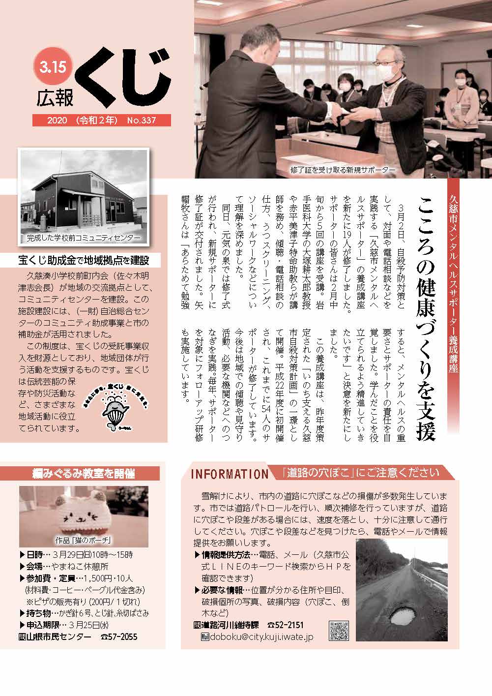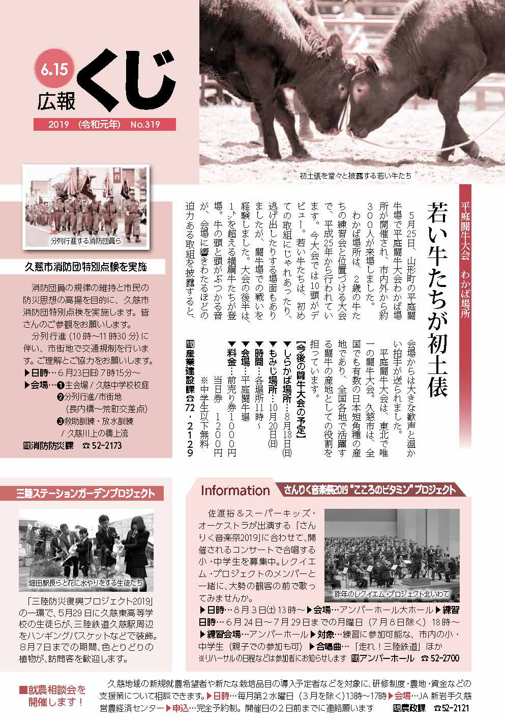「広報くじ」は、本号を毎月1日、お知らせ号を毎月15日に発行します。1日、15日が土日・祝日の場合は、発行日を繰り上げます。行政連絡区長を通じて、市内全域に配布します。