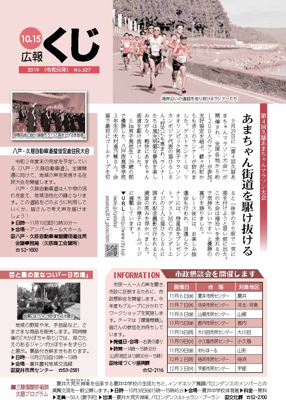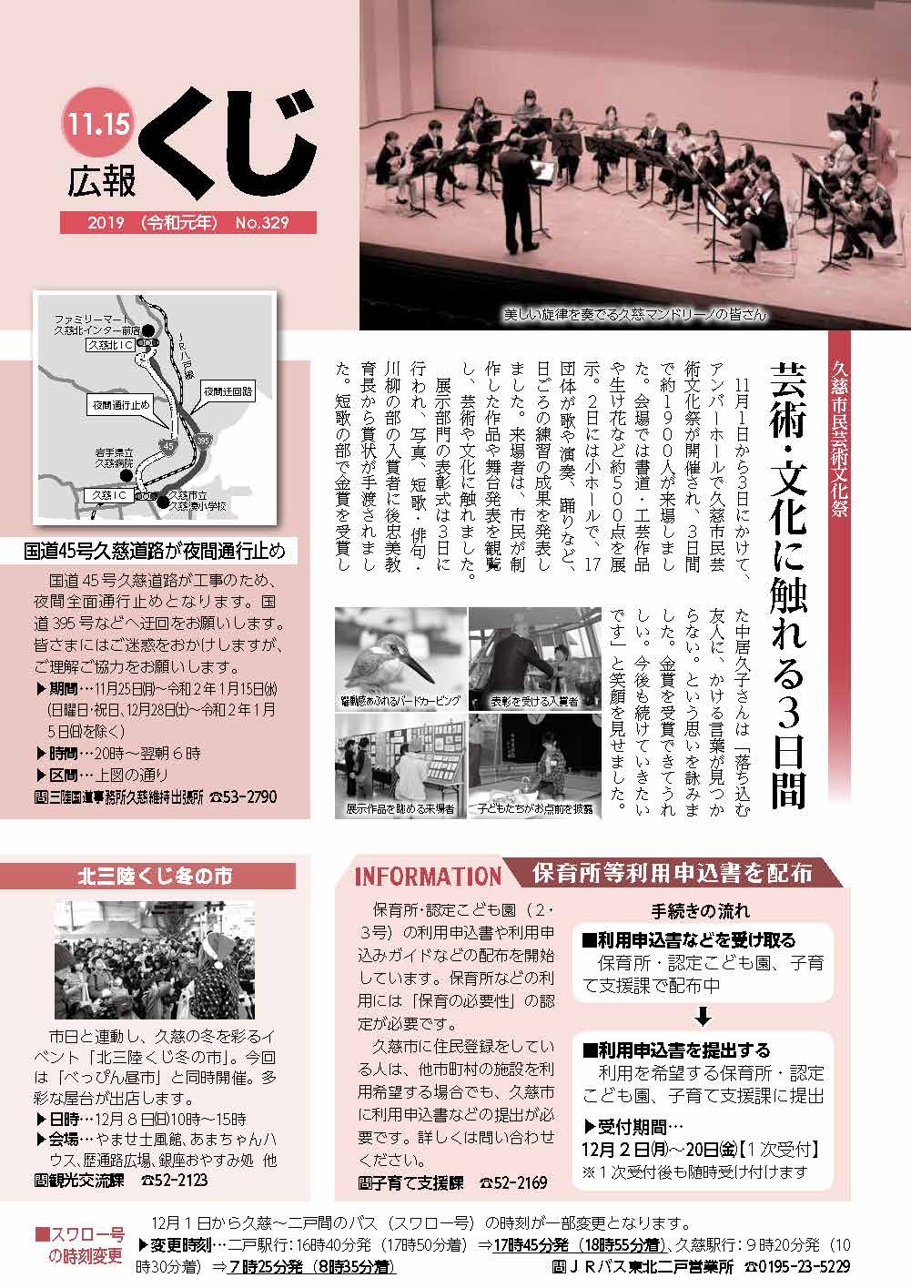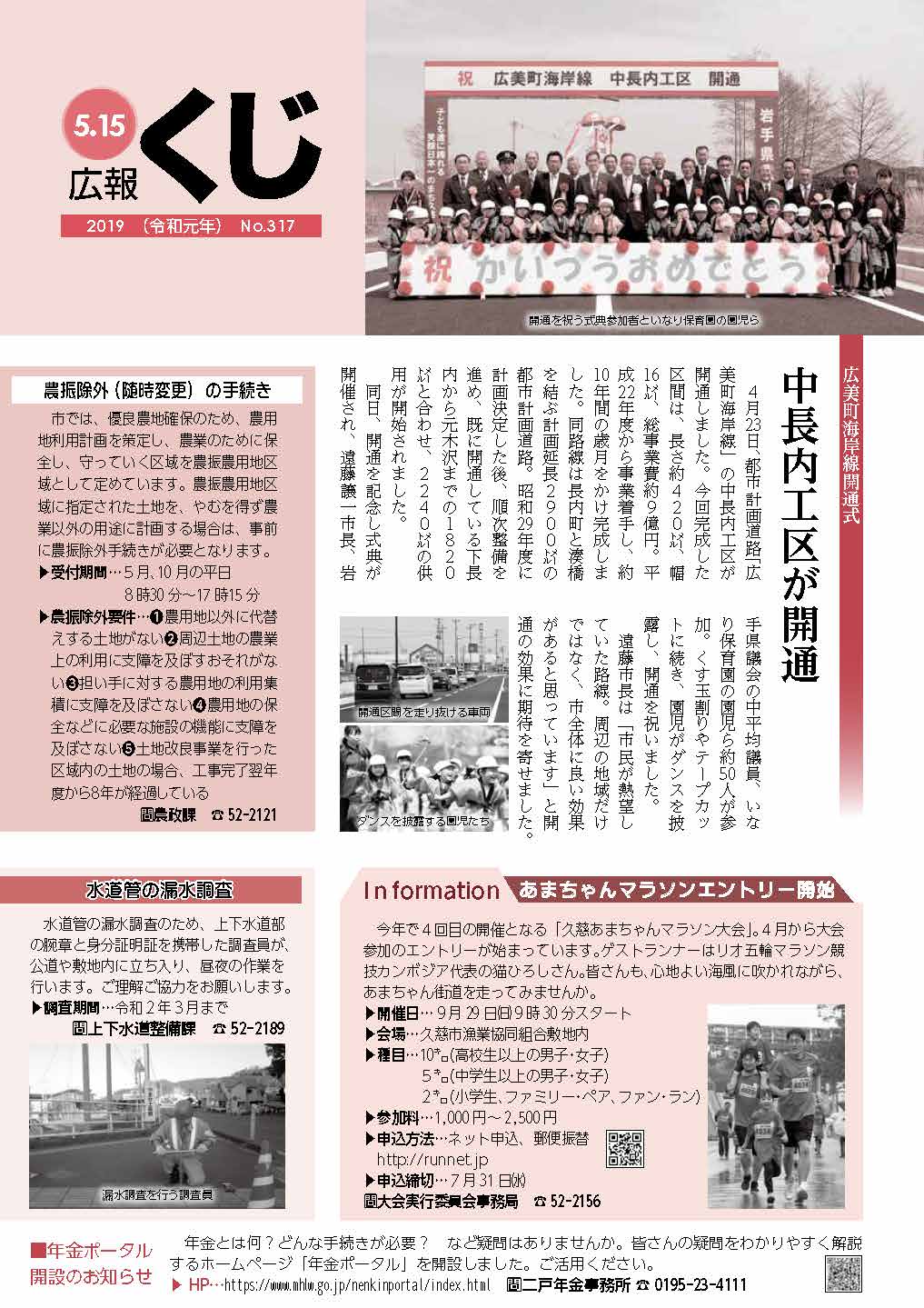 「広報くじ」は、本号を毎月1日、お知らせ号を毎月15日に発行します。1日、15日が土日・祝日の場合は、発行日を繰り上げます。行政連絡区長を通じて、市内全域に配布します。