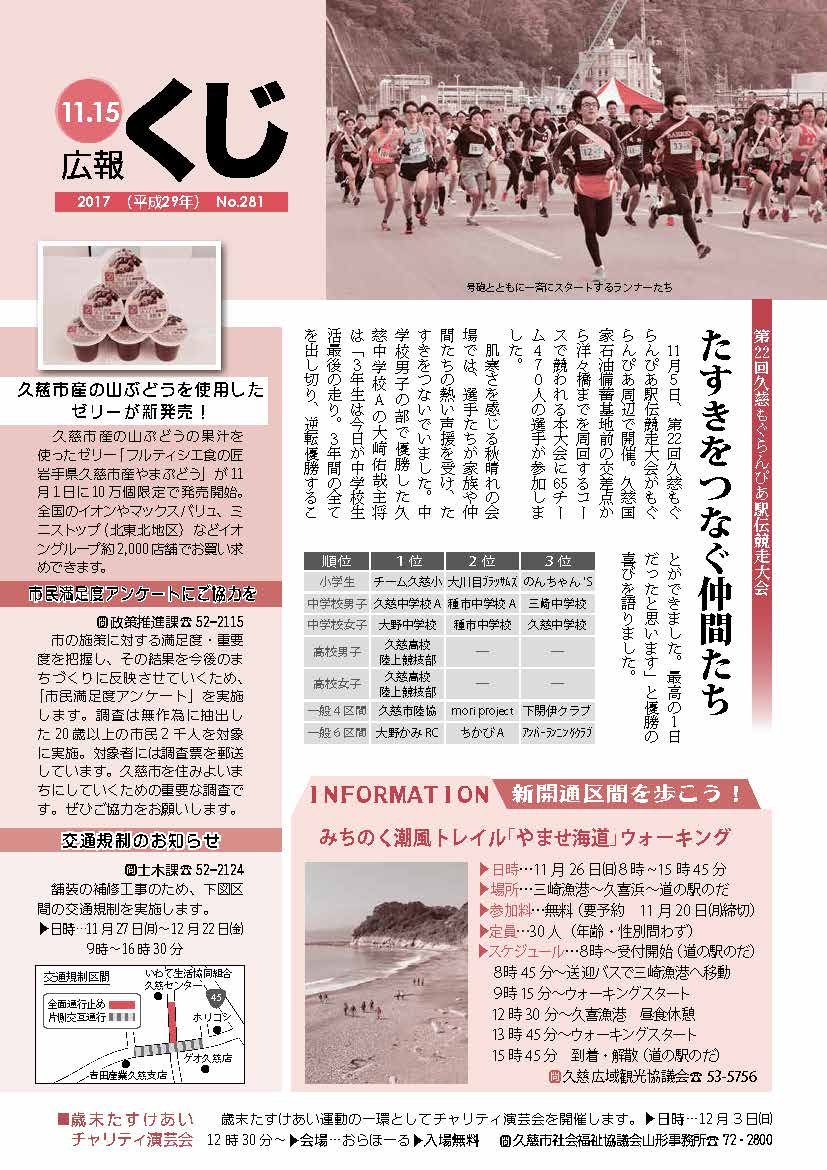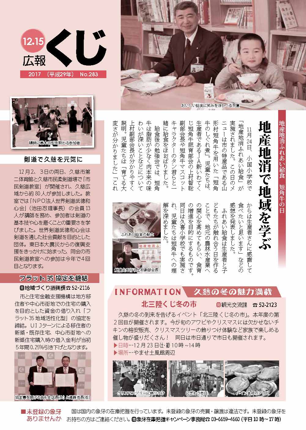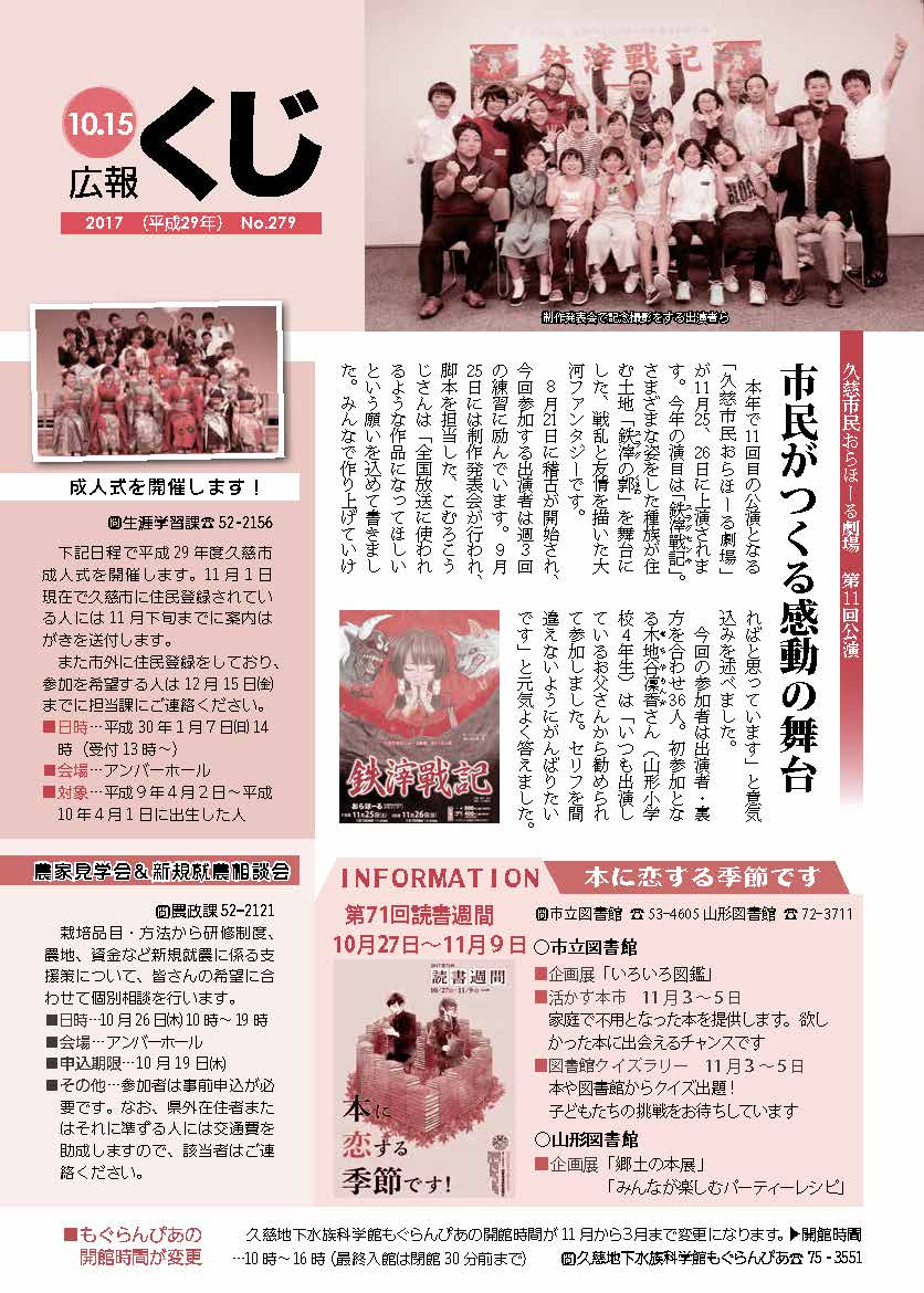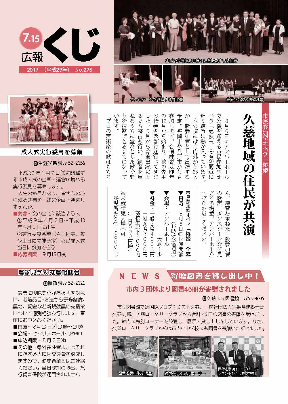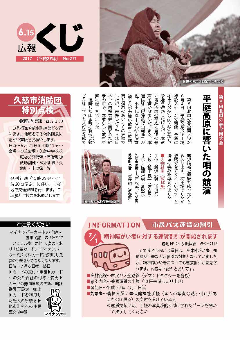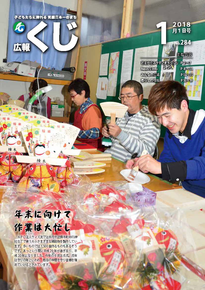「広報くじ」は、本号を毎月1日、お知らせ号を毎月15日に発行します。1日、15日が土日・祝日の場合は、発行日を繰り上げます。行政連絡区長を通じて、市内全域に配布します。