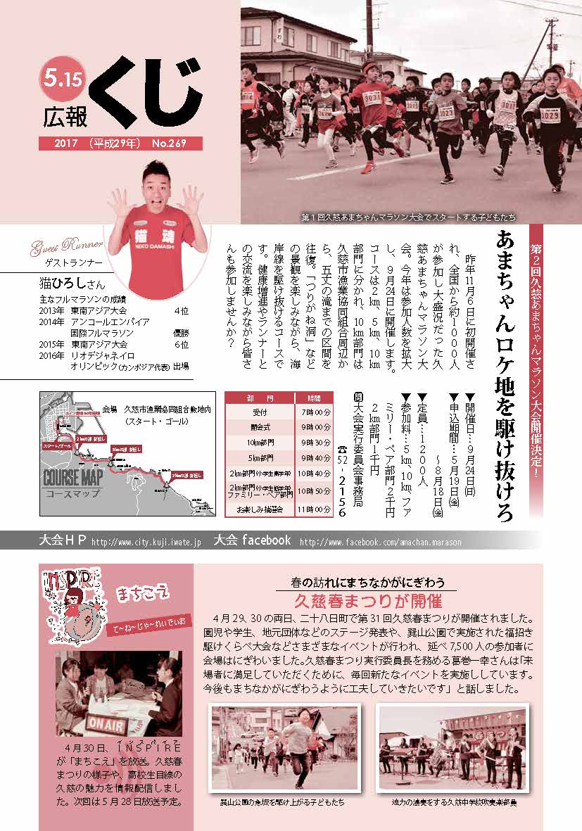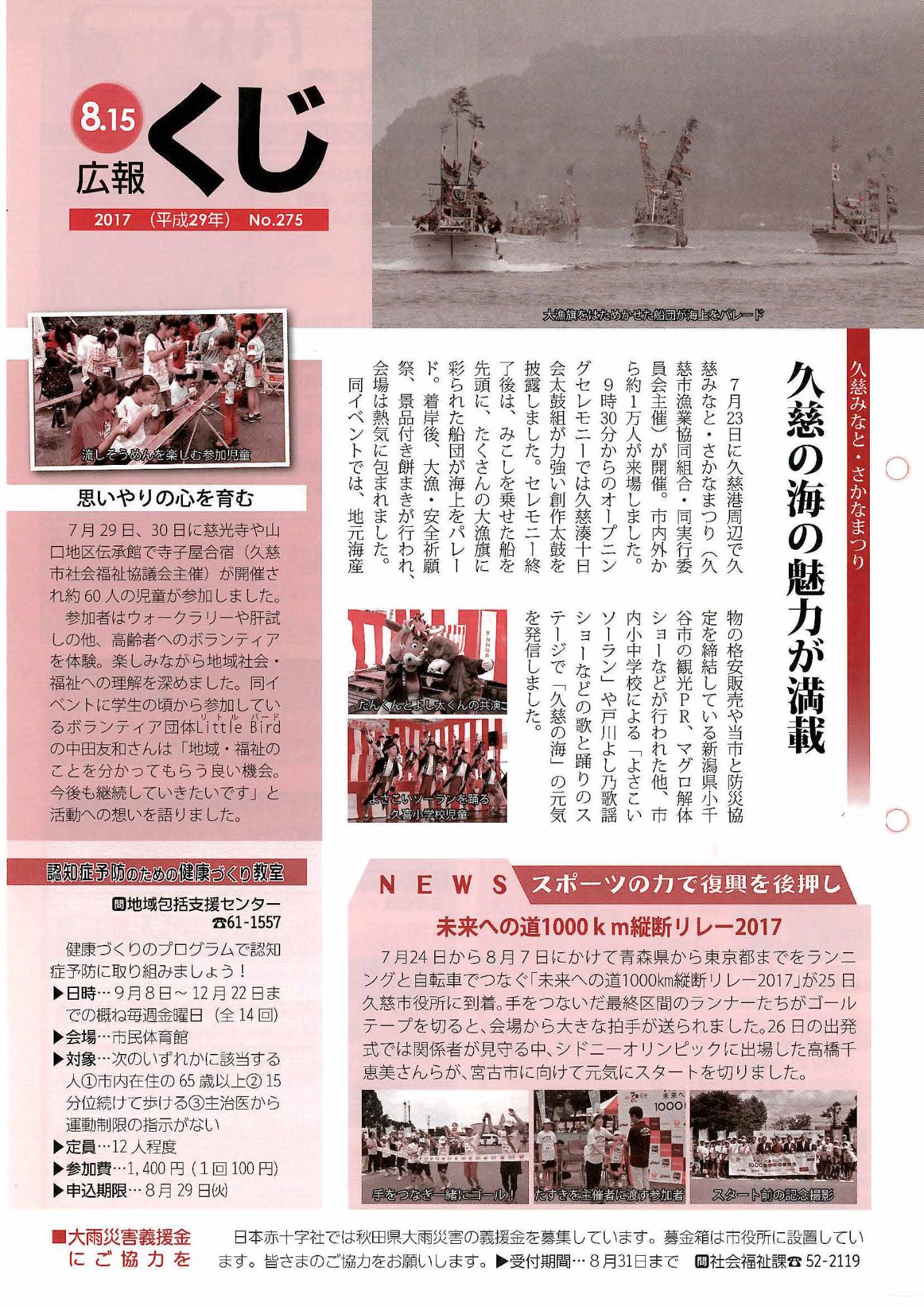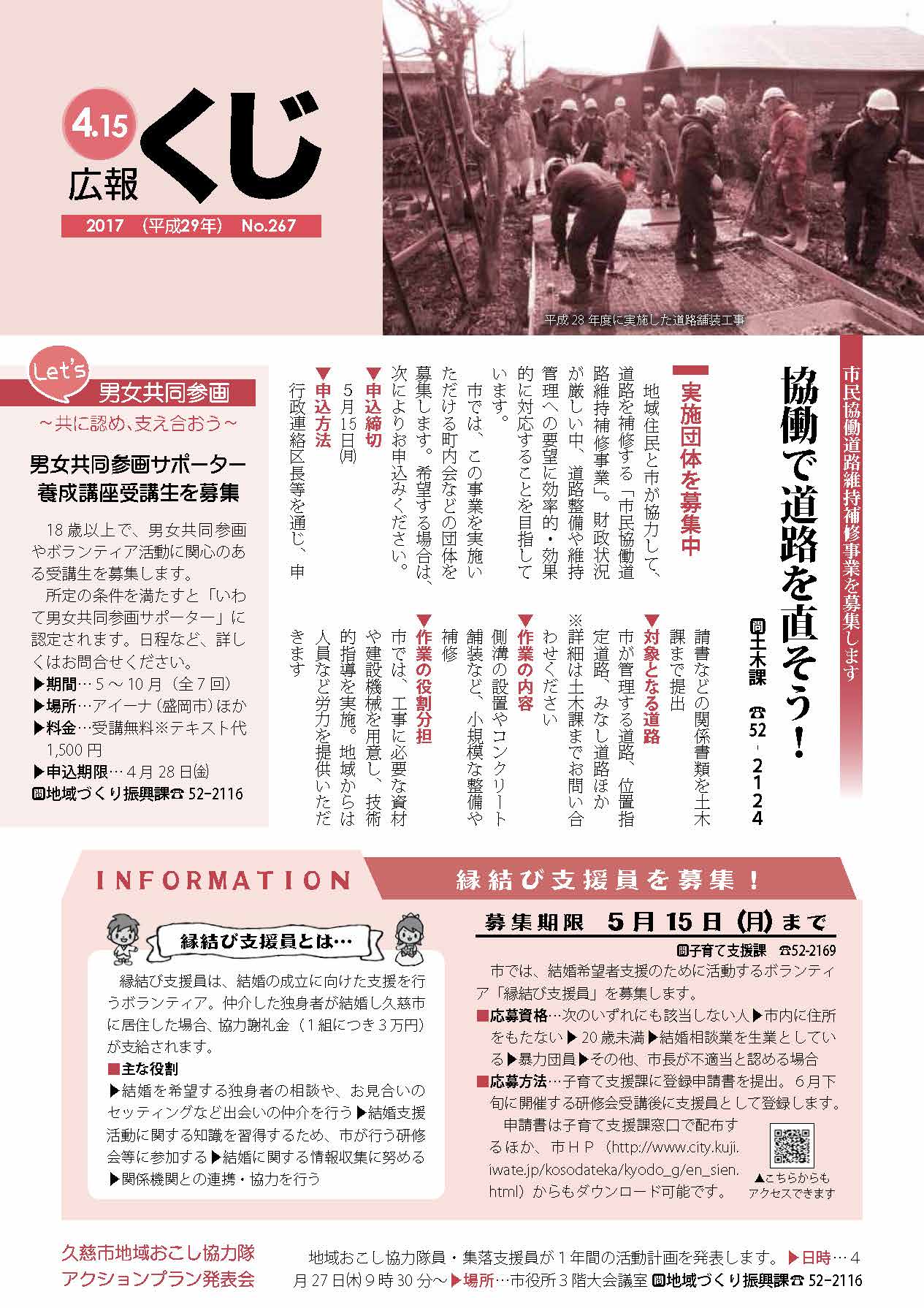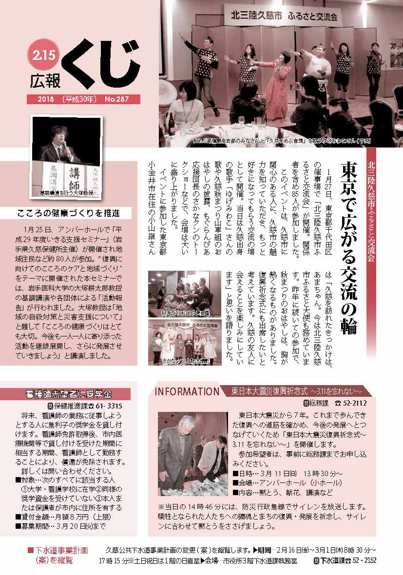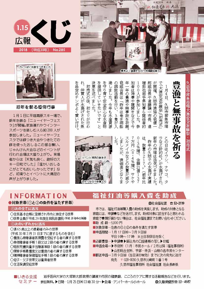 「広報くじ」は、本号を毎月1日、お知らせ号を毎月15日に発行します。1日、15日が土日・祝日の場合は、発行日を繰り上げます。行政連絡区長を通じて、市内全域に配布します。