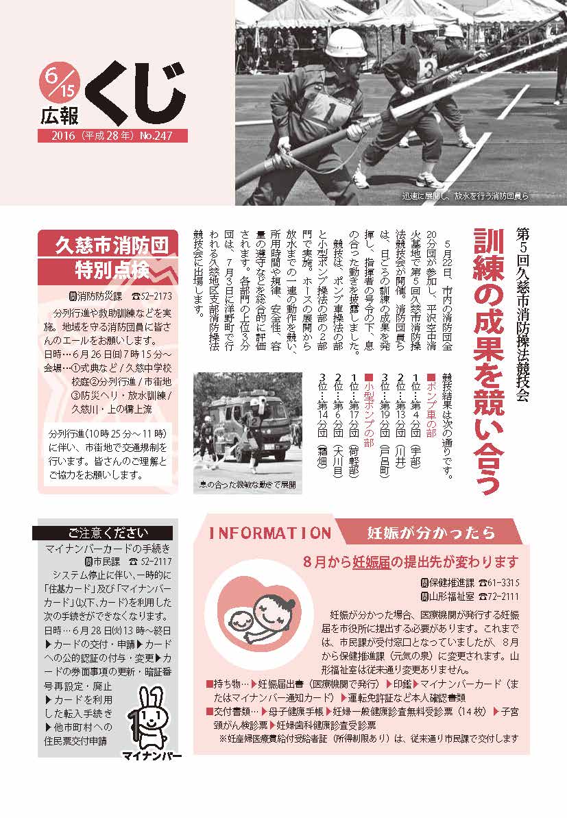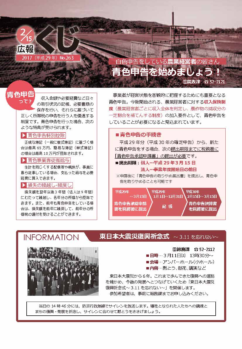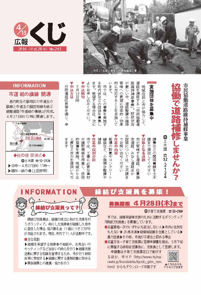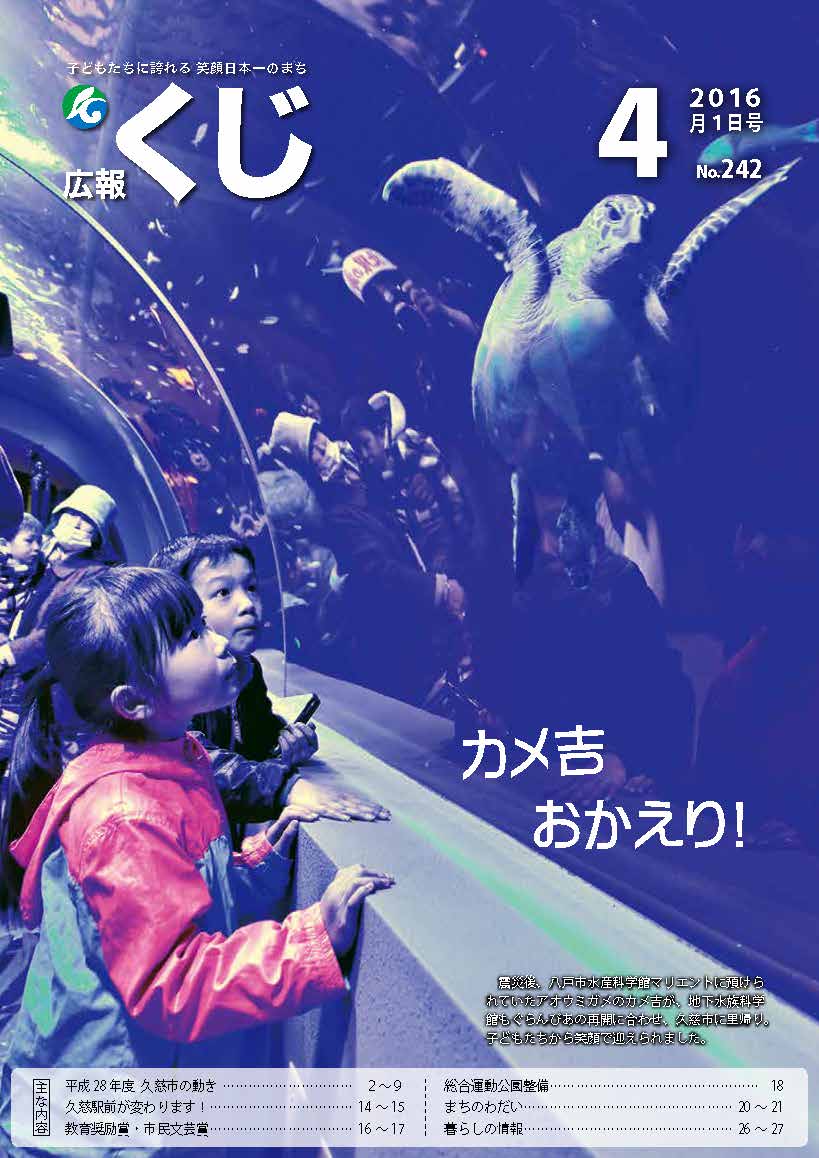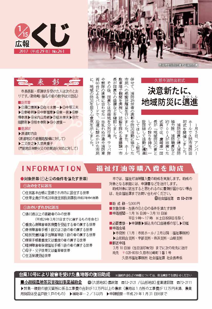「広報くじ」は、本号を毎月1日、お知らせ号を毎月15日に発行します。1日、15日が土日・祝日の場合は、発行日を繰り上げます。行政連絡区長を通じて、市内全域に配布します。