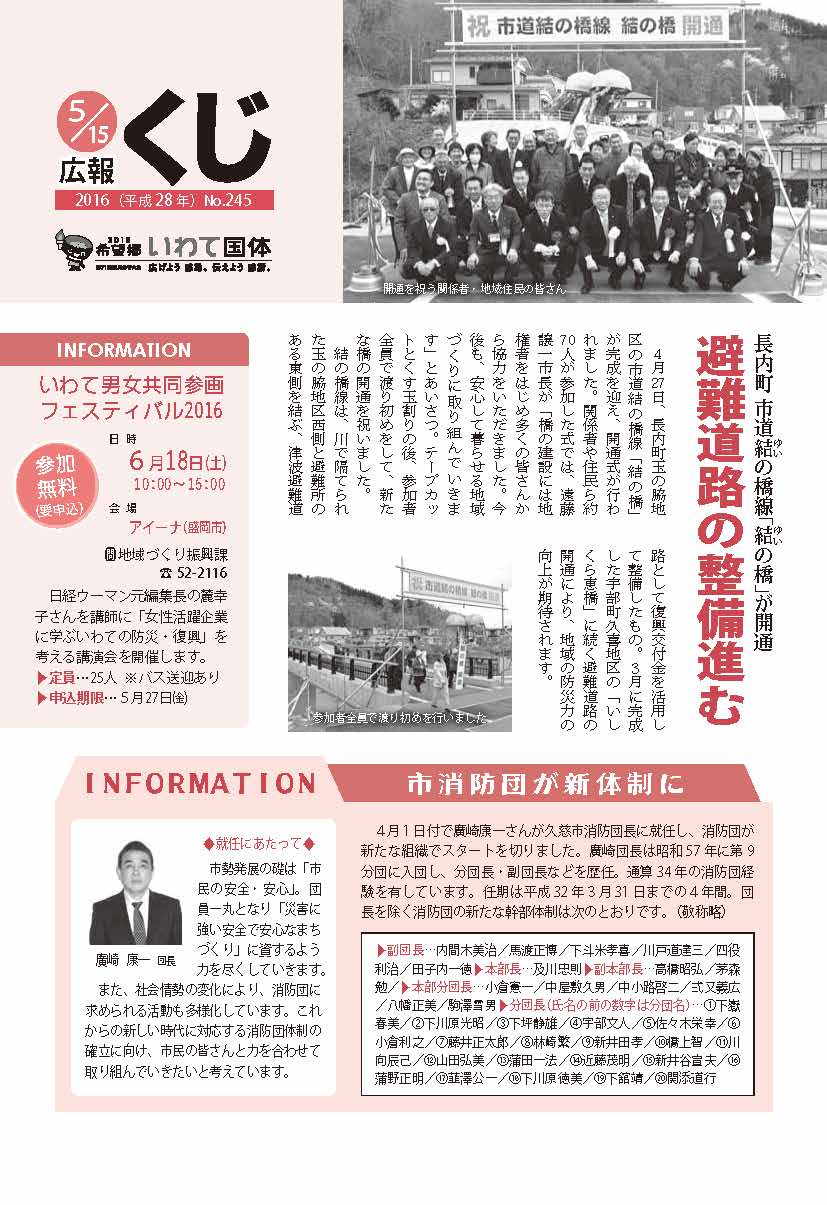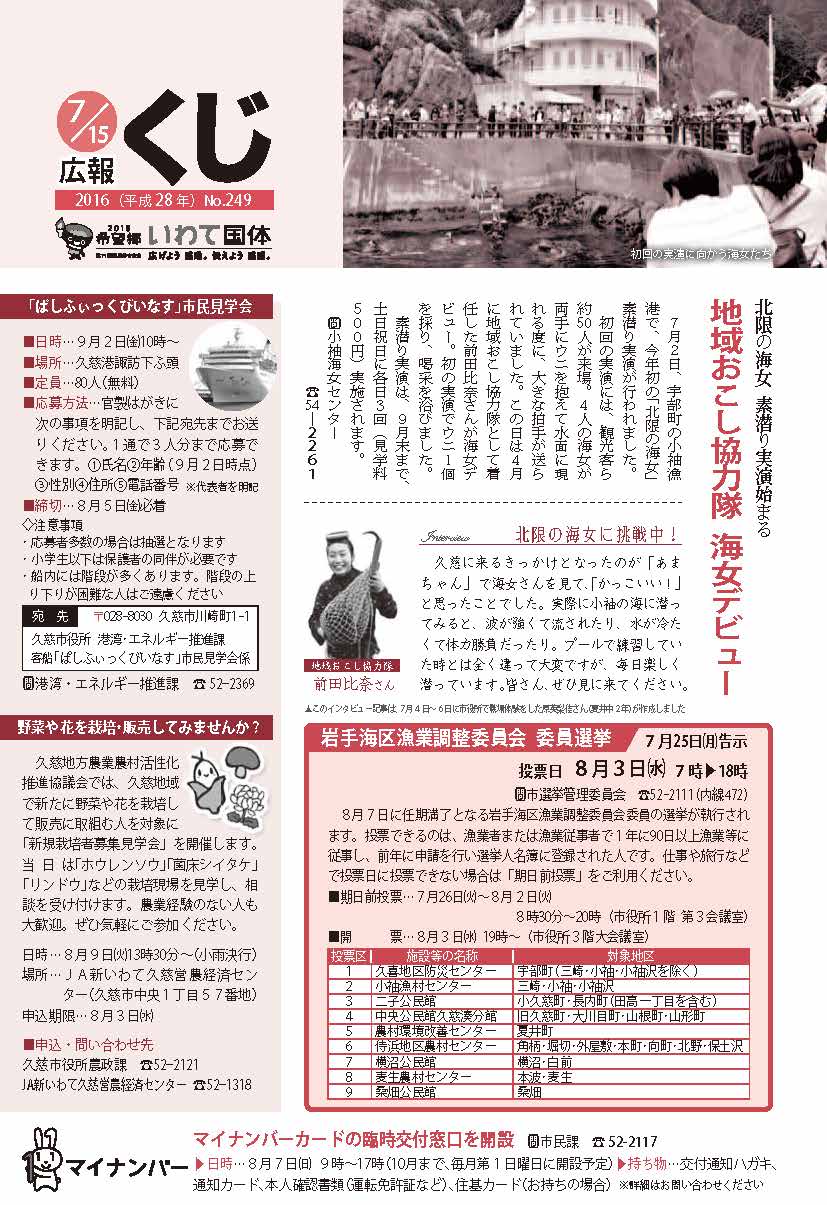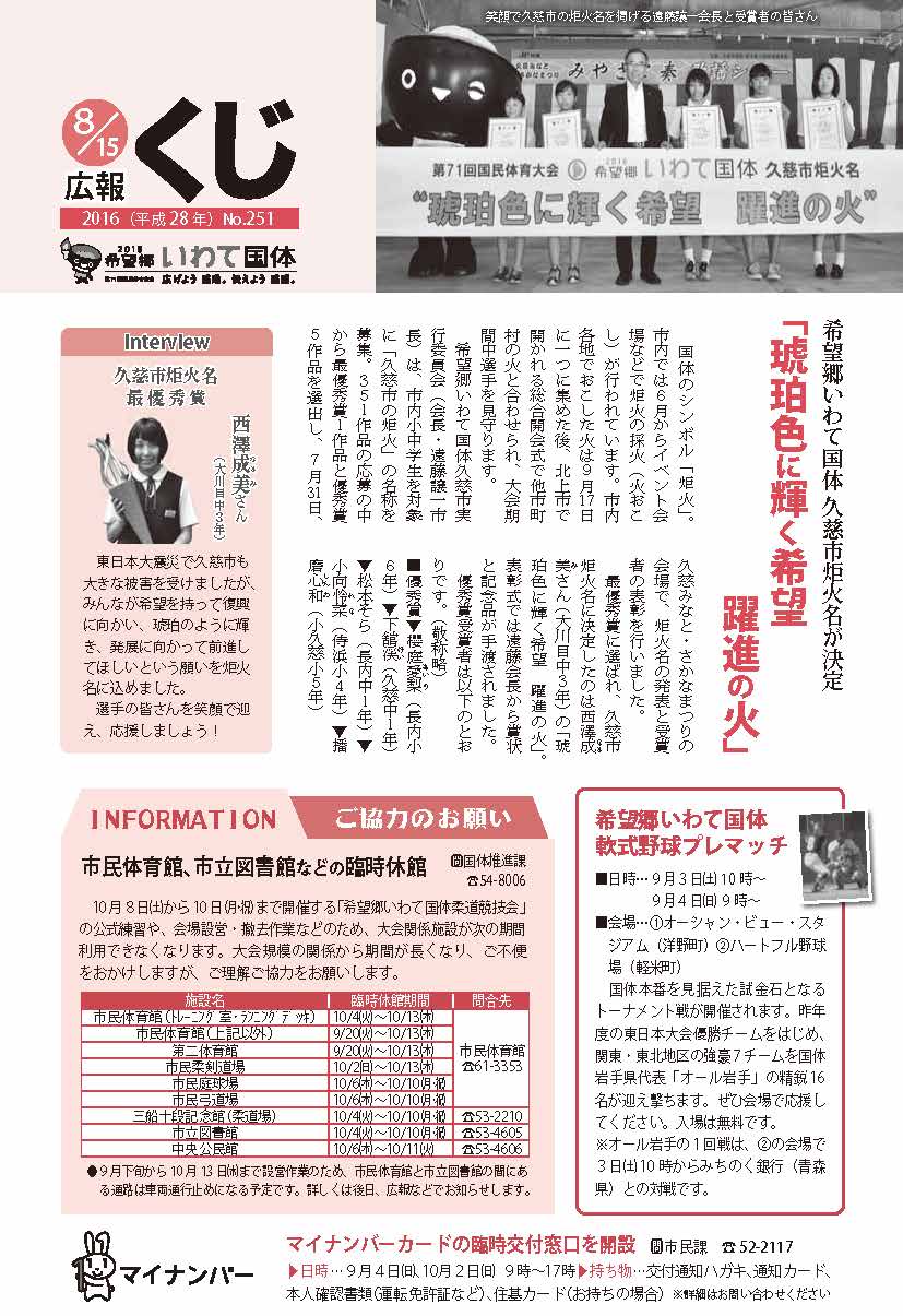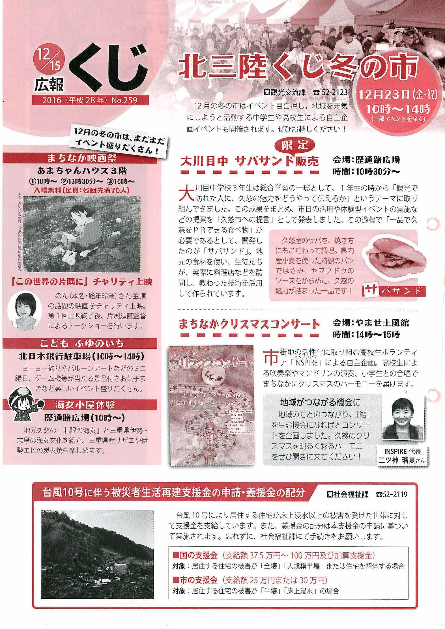 「広報くじ」は、本号を毎月1日、お知らせ号を毎月15日に発行します。1日、15日が土日・祝日の場合は、発行日を繰り上げます。行政連絡区長を通じて、市内全域に配布します。