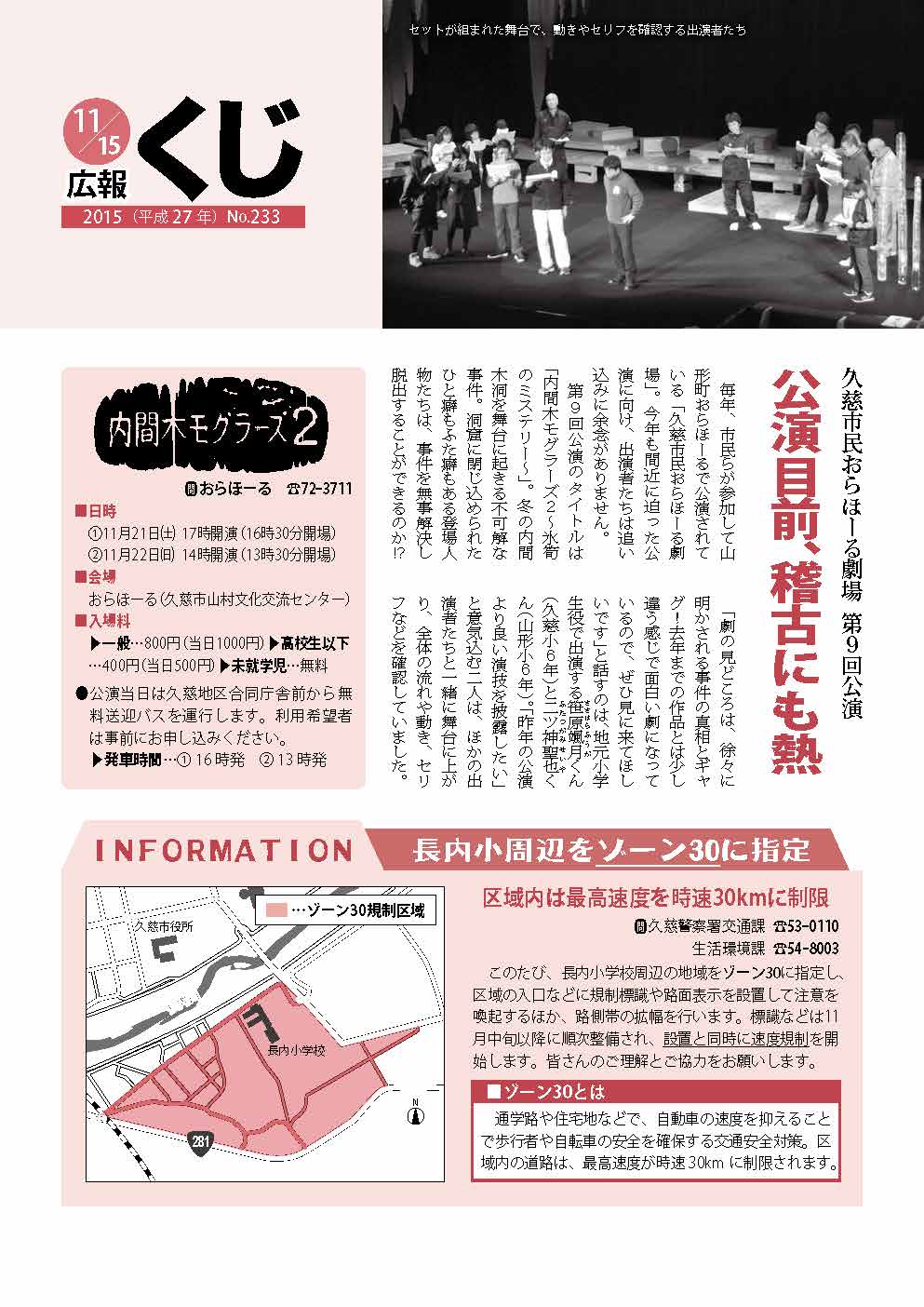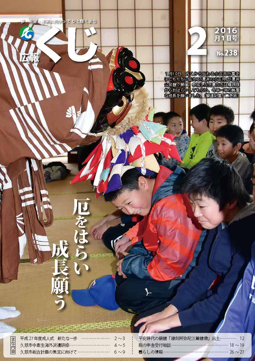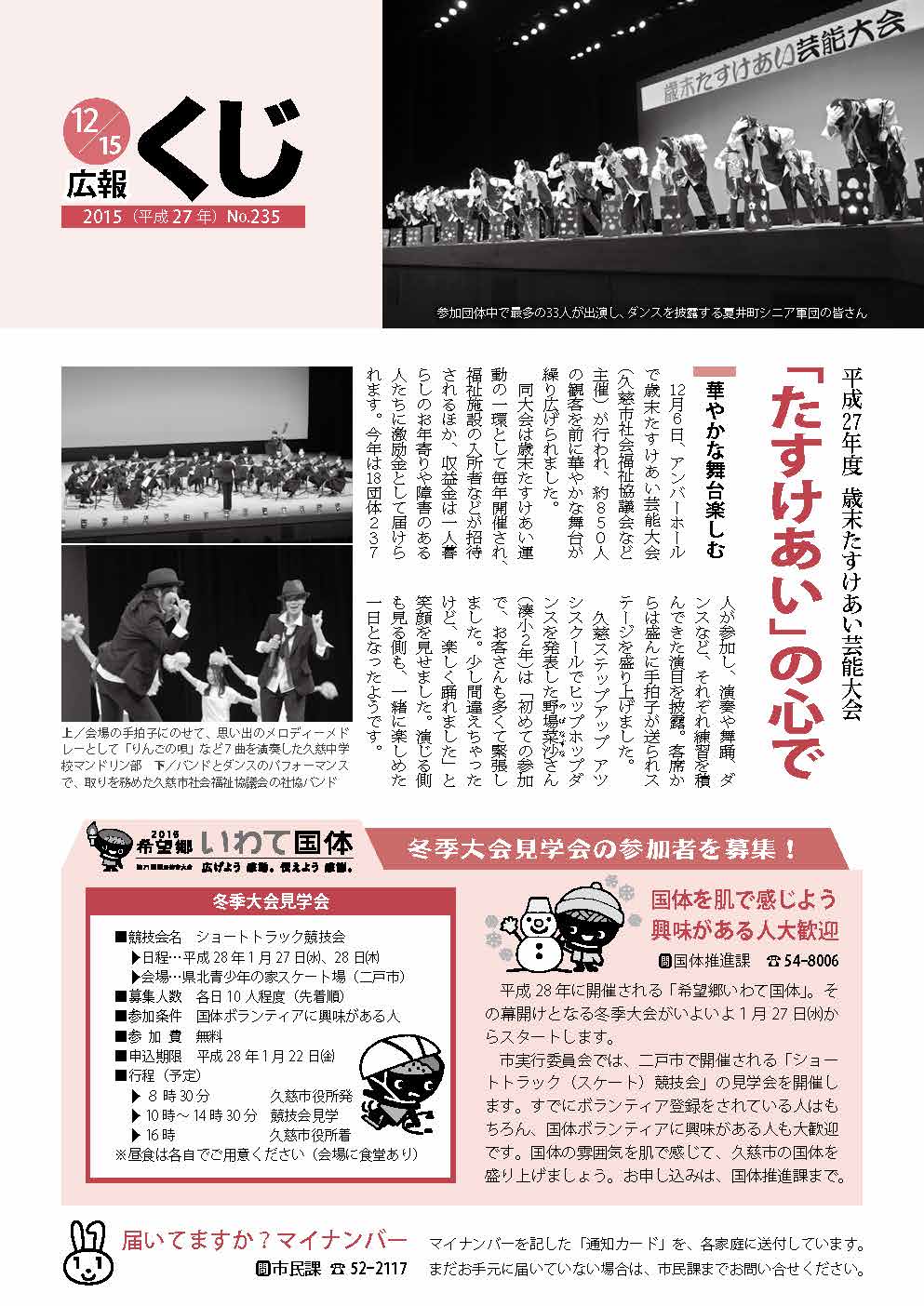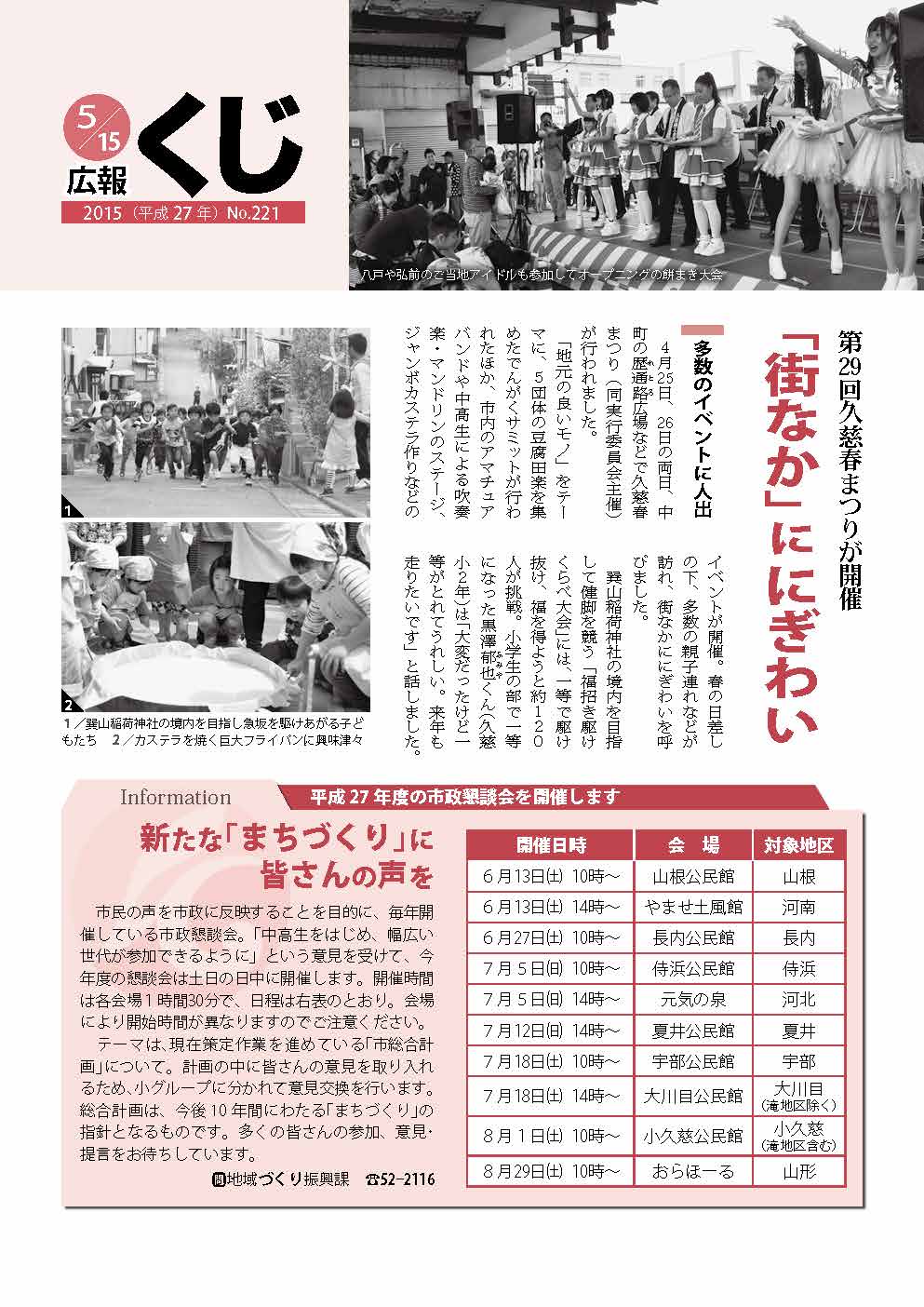 「広報くじ」は、本号を毎月1日、お知らせ号を毎月15日に発行します。1日、15日が土日・祝日の場合は、発行日を繰り上げます。行政連絡区長を通じて、市内全域に配布します。