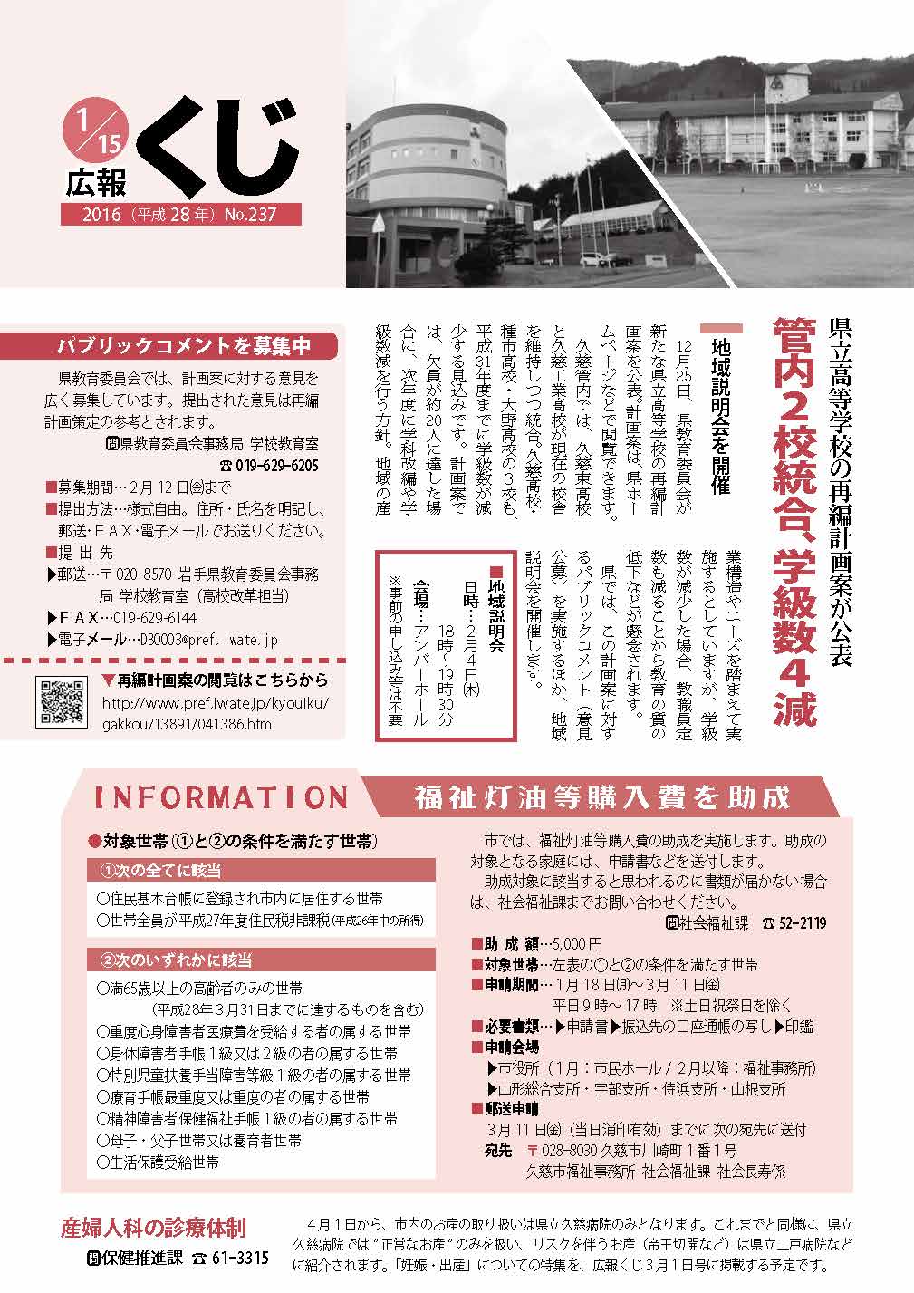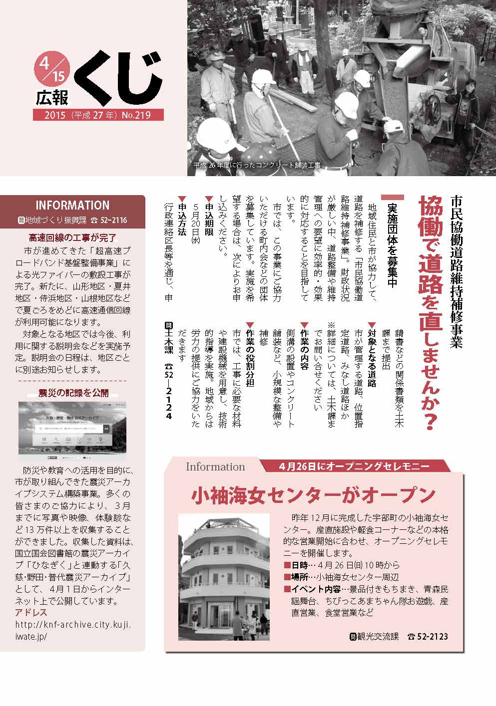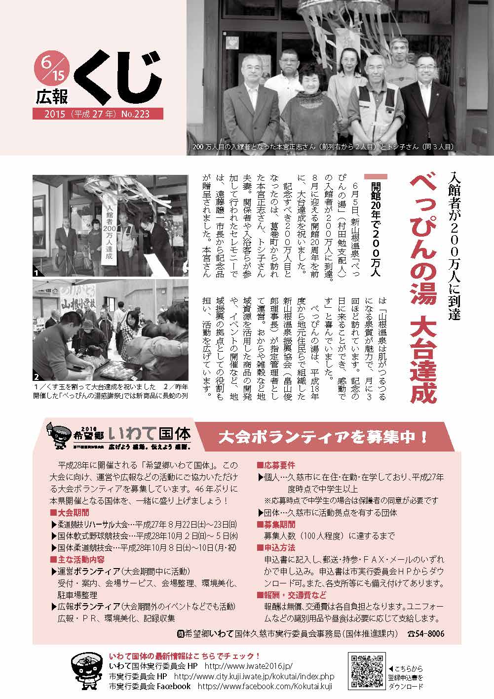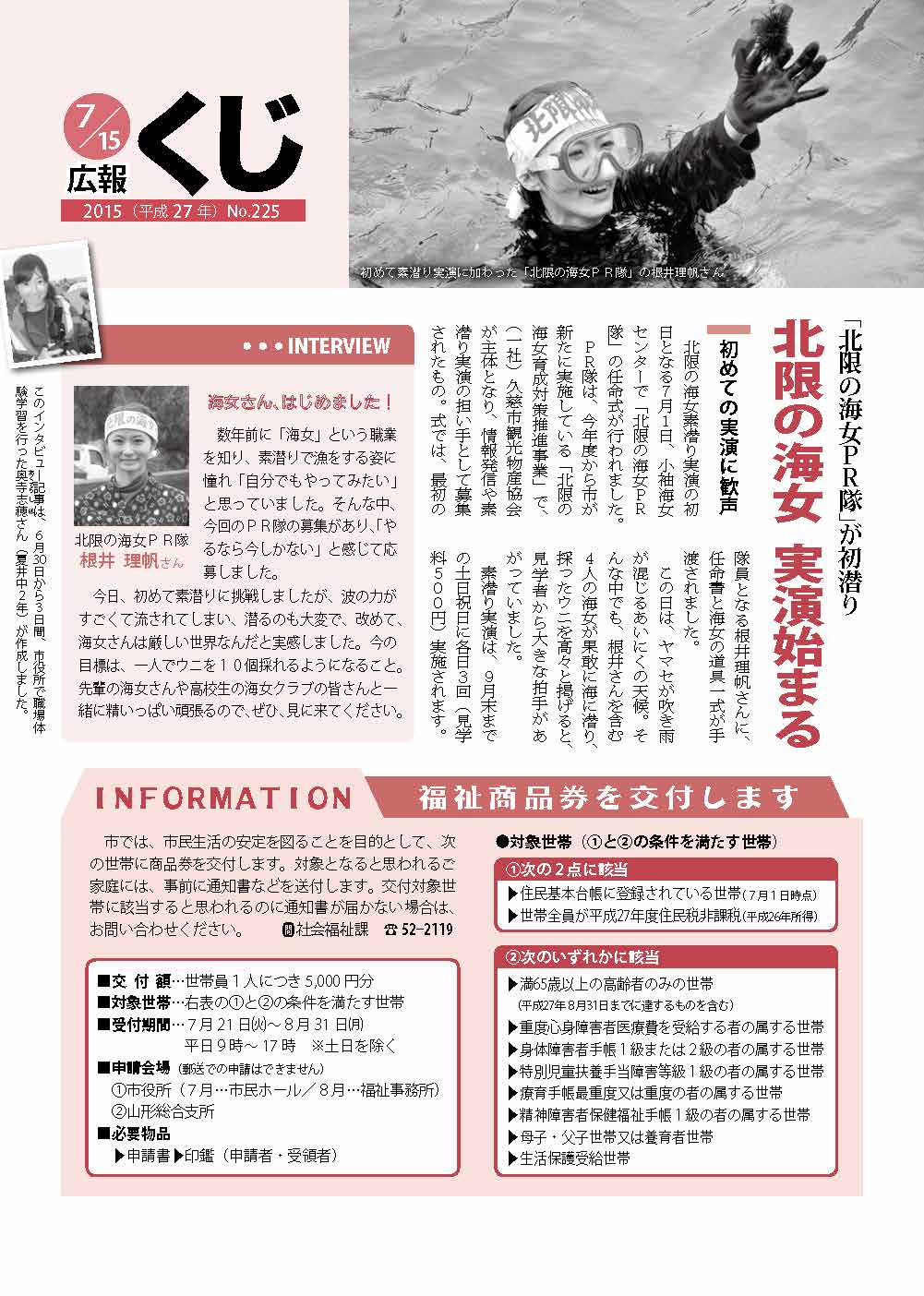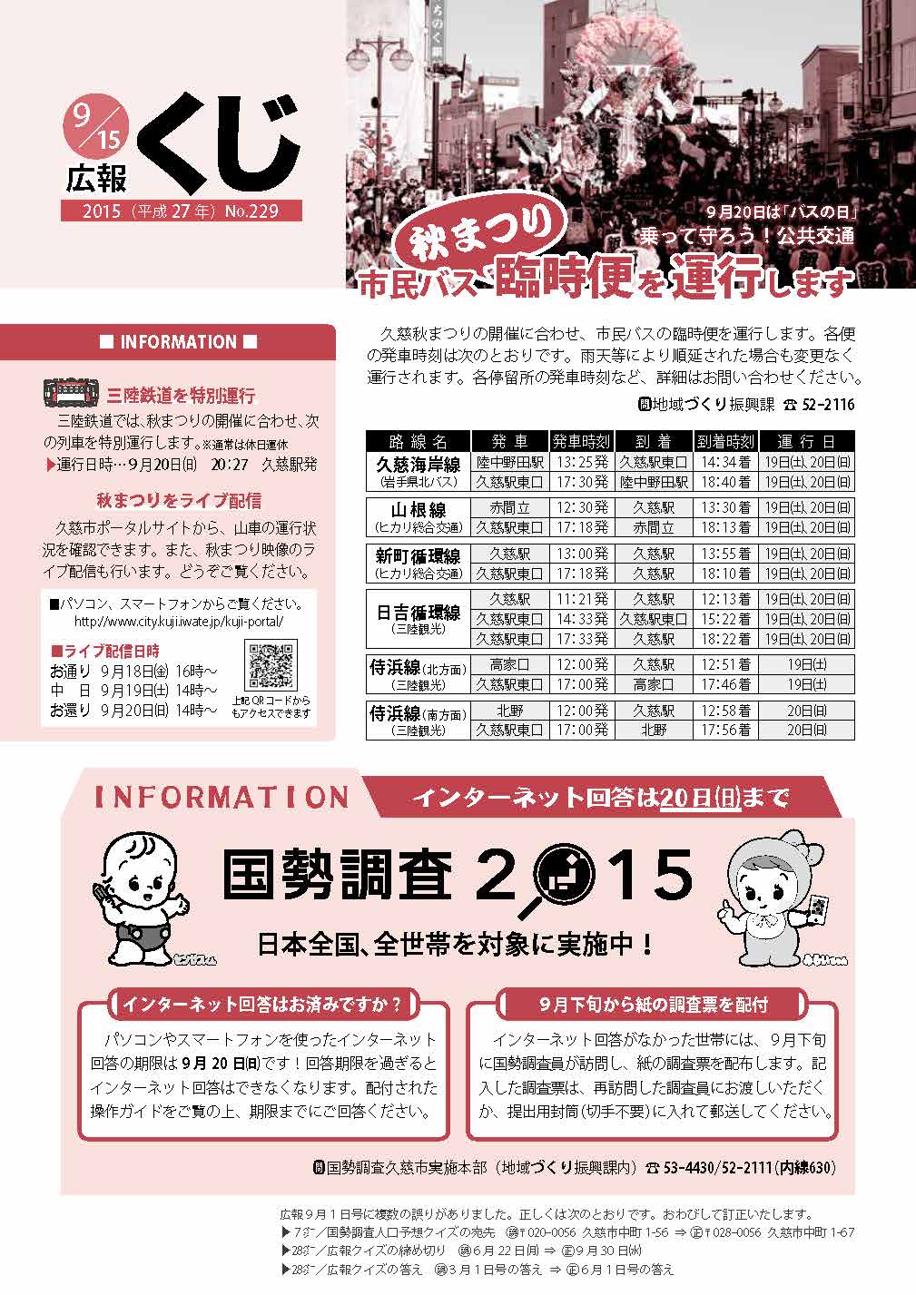 「広報くじ」は、本号を毎月1日、お知らせ号を毎月15日に発行します。1日、15日が土日・祝日の場合は、発行日を繰り上げます。行政連絡区長を通じて、市内全域に配布します。