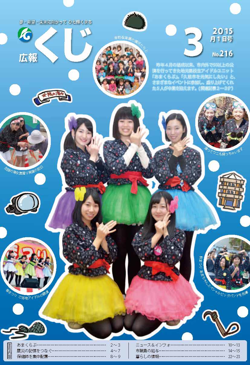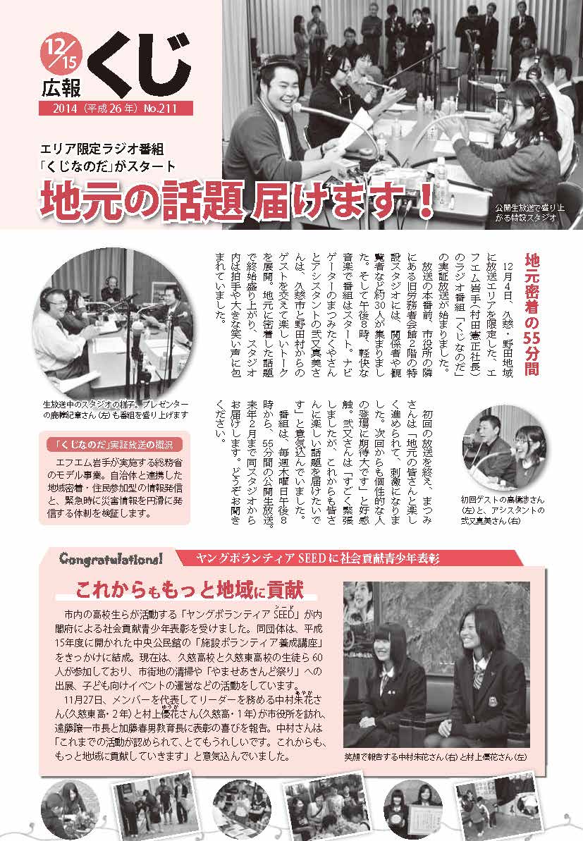「広報くじ」は、本号を毎月1日、お知らせ号を毎月15日に発行します。1日、15日が土日・祝日の場合は、発行日を繰り上げます。行政連絡区長を通じて、市内全域に配布します。