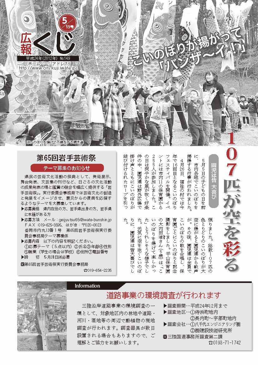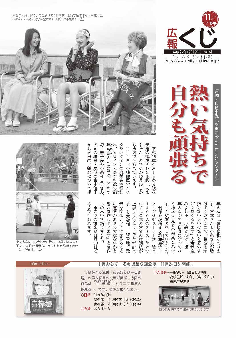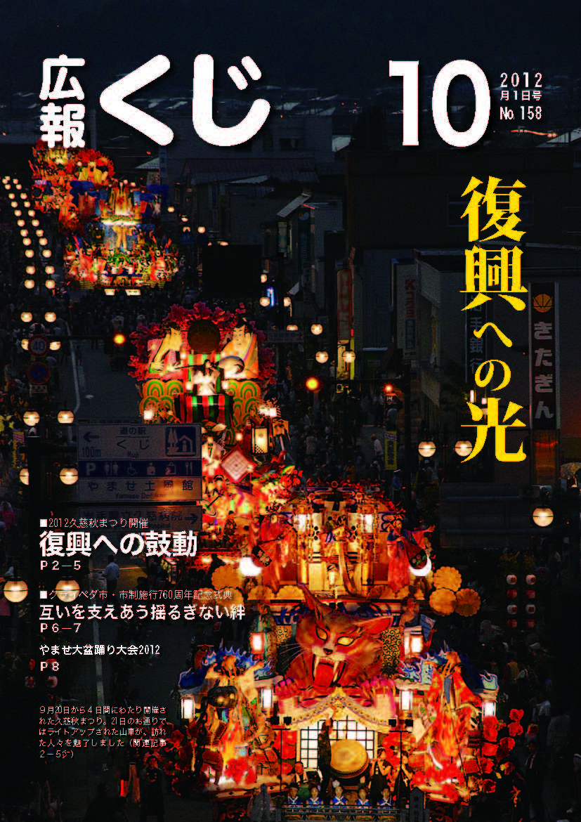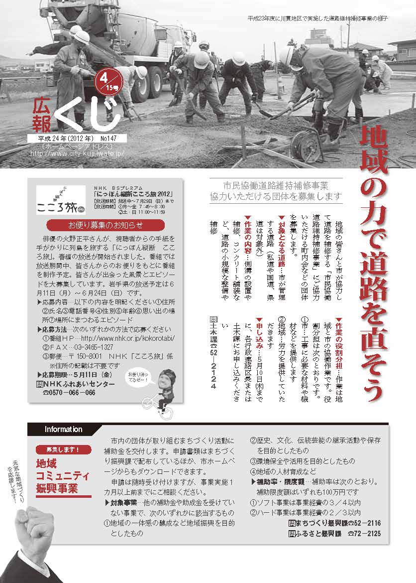 「広報くじ」は、本号を毎月1日、お知らせ号を毎月15日に発行します。1日、15日が土日・祝日の場合は、発行日を繰り上げます。行政連絡区長を通じて、市内全域に配布します。