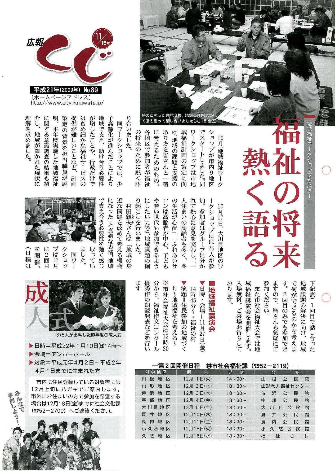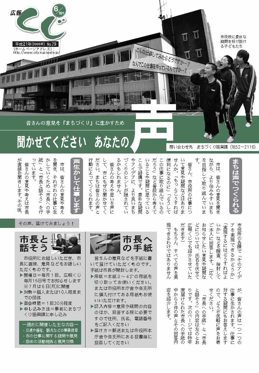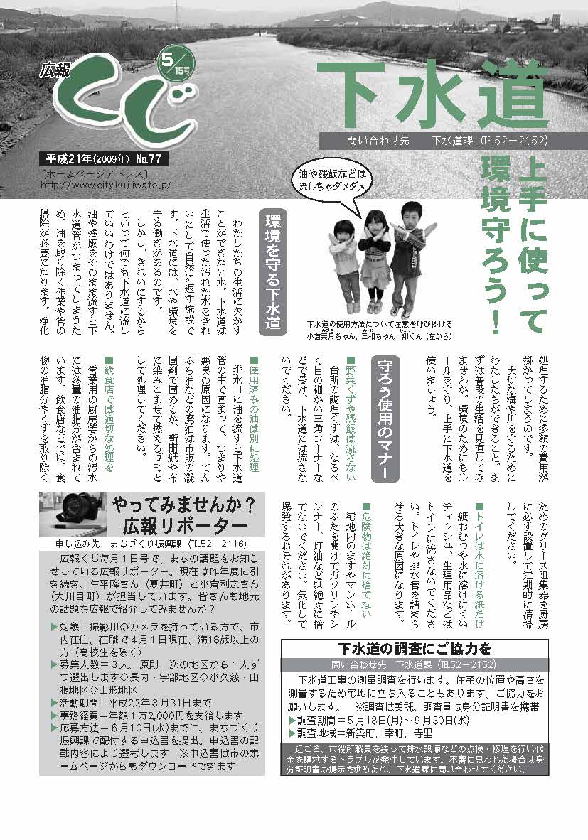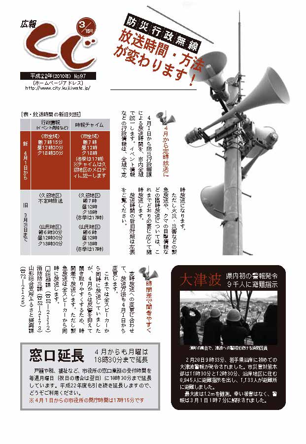 「広報くじ」は、本号を毎月1日、お知らせ号を毎月15日に発行します。1日、15日が土日・祝日の場合は、発行日を繰り上げます。行政連絡区長を通じて、市内全域に配布します。