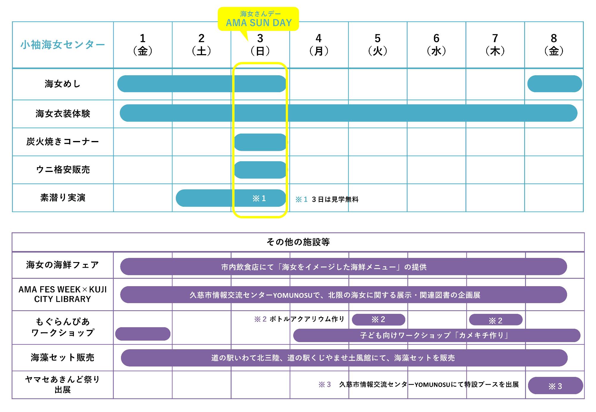 「あまちゃん」のメインロケ地となった久慈市沿岸南部の小袖地区にある小袖海女センターをメイン会場に、久慈市内でも様々なキャンペーンが開催されるイベントです。小袖海女センターでは期間限定の食堂メニューが登場するほか、8月3日(日曜日)にメインイベントを開催します。