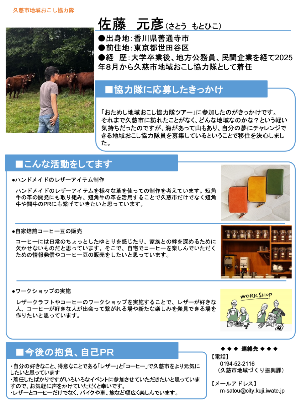 地域おこし協力隊の紹介 佐藤 元彦 更新日:2025年10月17日 ページID : 5830 この記事に関するお問い合わせ先 総合政策部 地域づくり振興課〒028-8030 岩手県久慈市川崎町1番1号 本庁舎2階電話番号:0194-52-2116お問い合わせフォーム(メールフォームへリンクします)
