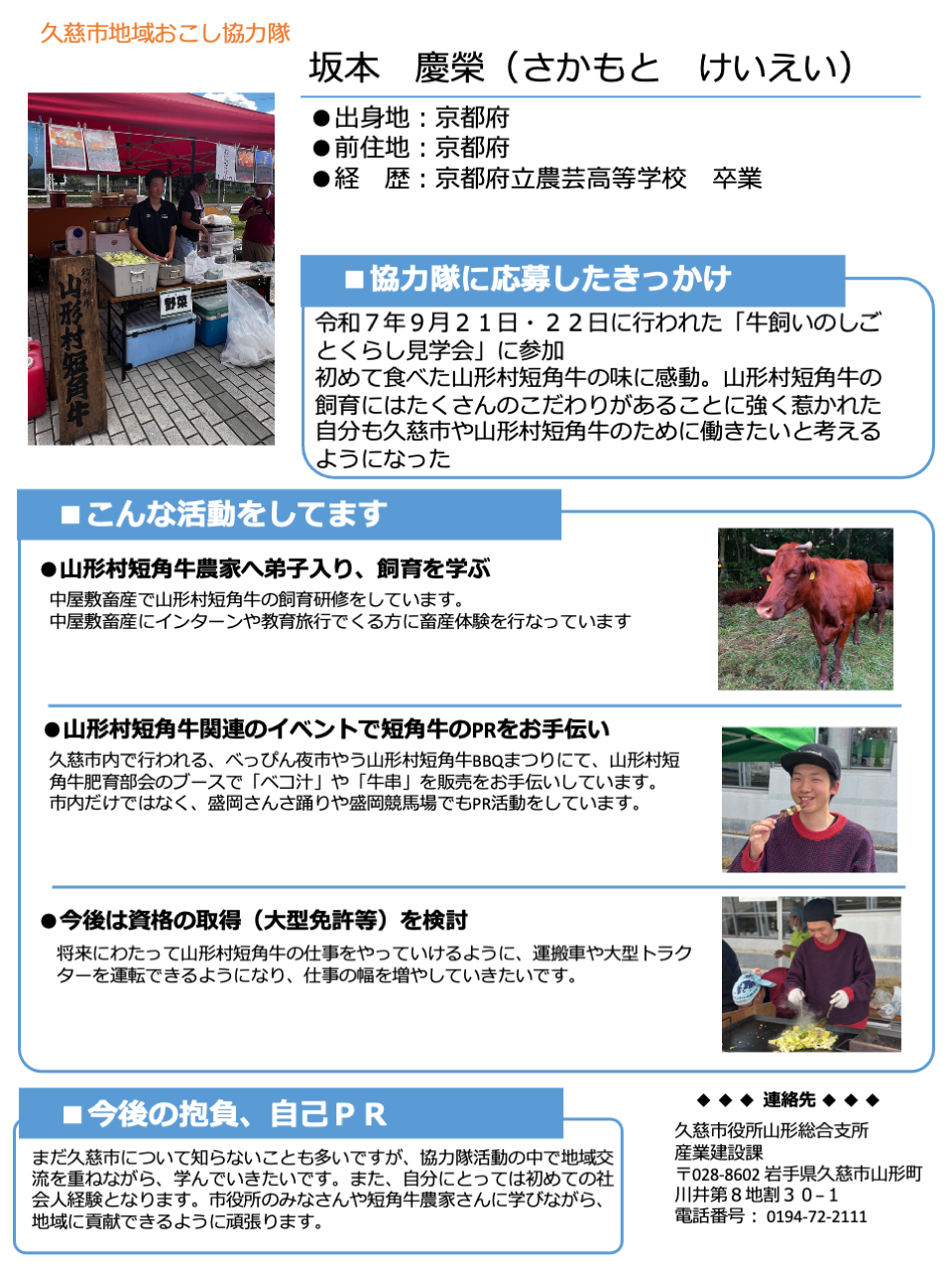 地域おこし協力隊の紹介 坂本慶榮 更新日:2025年10月27日 ページID : 6100 この記事に関するお問い合わせ先 総合政策部 地域づくり振興課〒028-8030 岩手県久慈市川崎町1番1号 本庁舎2階電話番号:0194-52-2116お問い合わせフォーム(メールフォームへリンクします)